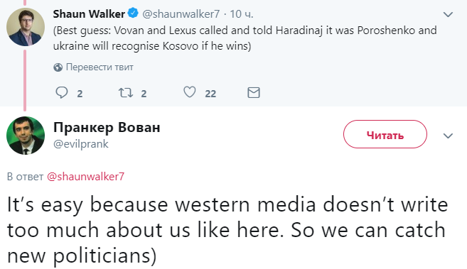 "Судя по всему, премьеру Косова позвонили кремлевские пранкеры Вован и Лексус. Как политки еще могут вестись на такое?!", - написал британский журналист Шон Уокер, приводя скрин заявления Харадиная.