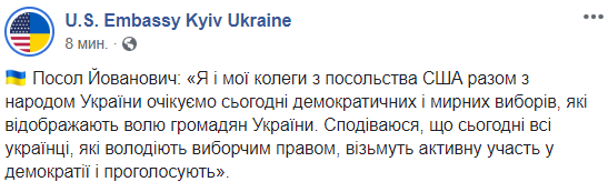 "Я и мои коллеги из посольства США вместе с народом Украины ожидаем сегодня демократических и мирных выборов, которые отражают волю граждан Украины. Надеюсь, что сегодня все украинцы, обладающих избирательным правом, примут активное участие в демократии и проголосуют", - заявила Мари Йованович.