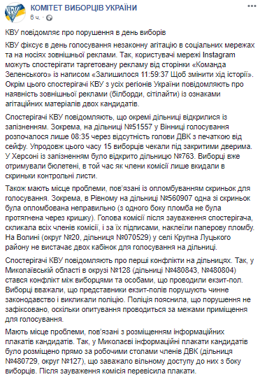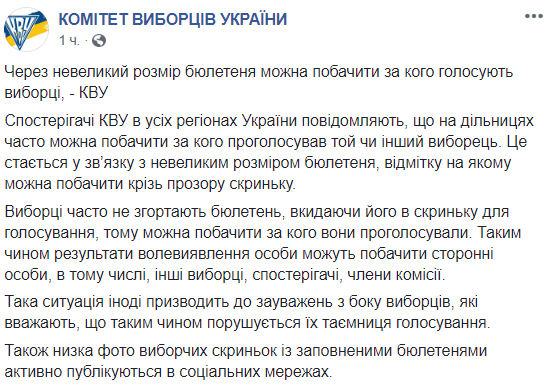 "Такая ситуация имеет место в Николаевской, Черкасской, Луганской, Житомирской, Запорожской, Винницкой, Хмельницкой, Сумской областях. По данным наблюдателей КИУ, в г.Николаеве на половине участков наблюдателей нет вообще. В Запорожье представители КИУ не заметили ни одного другого наблюдателя на восьми участках. На ряде УИК в Черкассах нет никаких наблюдателей. В прочих случаях на участках, как правило, присутствуют лишь 1-2 наблюдателя", - говорится в сообщении на странице КИУ в Facebook.