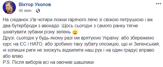 "На завтрак съел четыре ложки горячего лечо со свежей петрушкой и целых два бутерброда с авокадо. Что-то сегодня с самого утра тянет рвать зубами различную зелень", - пишет в Facebook политтехнолог Викто Уколов.