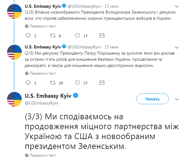 "Президент Трамп позвонил поздравить Владимира Зеленского с победой на выборах и украинский народ с мирными и демократическими выборами. Мы будем и дальше поддерживать усилия Украины в восстановлении территориальной целостности и отражения агрессии", - написал Волкер.