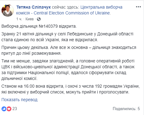 9:57 На данный момент не открыт лишь один избирательный участок по всей стране - поселке Лебединское Донецкой области.