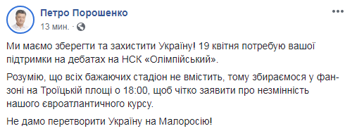 "Мы должны сохранить и защитить Украину! 19 апреля нуждаюсь в вашей поддержке на дебaтах на НСК "Олимпийский". Понимаю, что всех желающих стадион не вместит, поэтому собираемся в фан-зоне на Троицкой площади в 18:00, чтобы четко заявить о неизменности нашего евроатлантического курса. Не дадим превратить Украину в Малороссию!" - говорится в заявлении на фб-странице Порошенко.