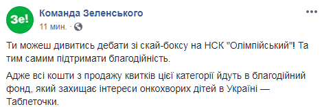Также в команде Зе напомнили, что дебаты также будут показывать в скай-боксах на НСК "Олимпийский". Купившие туда билеты тем самым поддержат благотворительность. "Ведь все средства от продажи билетов этой категории идут в благотворительный фонд, который защищает интересы онкобольных детей в Украине - Таблеточки", - говорится в опубликованном сообщении.