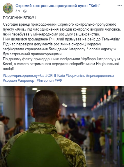 Утром в субботу, 20 апреля, в Киеве пограничники задержали россиянина, который находился в международном розыске. Об этом сообщает пресс-служба пропускного пункта "Киев" на своей странице в Facebook.