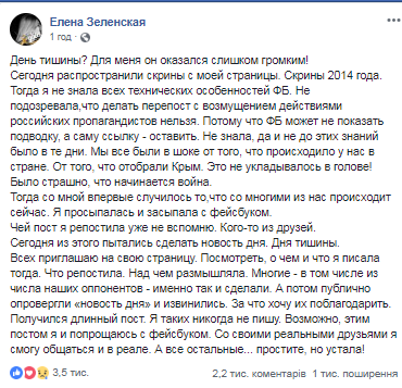 Получился длинный пост. Я таких никогда не пишу. Возможно, этим постом я и попрощаюсь с фейсбуком. Со своими реальными друзьями я смогу общаться и в реале. А все остальные... простите, но устала!", - написала Елена Зенленская.