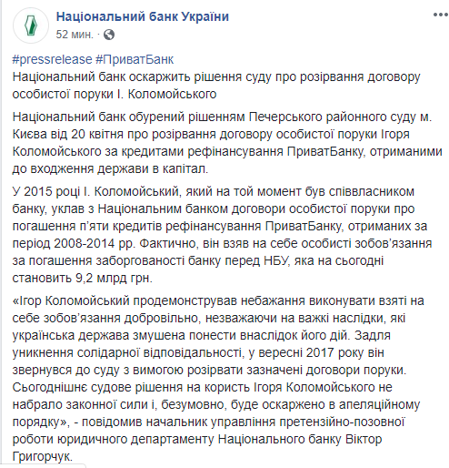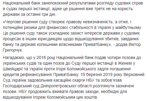 "Очередное решение суда создает правовую неопределенность, а следовательно, и потенциальные риски для финансовой стабильности в Украине в будущем. Это решение суда также усложняет защиту интересов государства в судебных процессах в других юрисдикциях по возмещению убытков, причиненных банку и государству бывшими владельцами Приватбанка", - заявил начальник управления претензионно-исковой работы юридического департамента Национального банка Виктор Григорчук.
