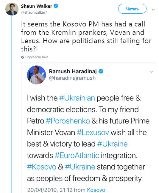 "Судя по всему, премьеру Косова позвонили кремлевские пранкеры Вован и Лексус. Как политики еще могут вестись на такое?!", - написал британский журналист Шон Уокер, приводя скрин заявления Харадиная.