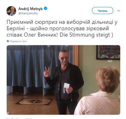 "Приятный сюрприз - на избирательном участке в Берлине - только что проголосовал звездный певец Олег Винник", - написал Мельник.