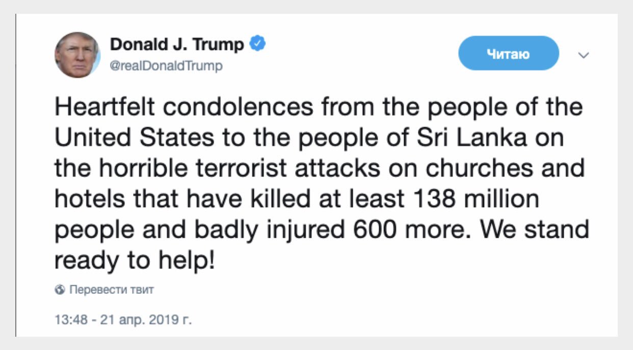 "Искренние соболезнования народу Шри-Ланки из-за ужасных террористических нападений на церкви и гостиницы, в результате которых погибло по меньшей мере 138 000 000 человек и сильно пострадало 600 человек. Мы готовы помочь!", - написал он сперва в сети, но потом удалил пост и выложил новый, уже без ошибок.