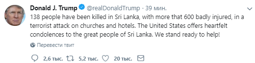 Президент США Дональд Трамп ошибочно заявил, что в результате сегодняшних взрывов на Шри-Ланке погибли 138 миллионов человек. Об этом он написал на своей странице в Twitter.