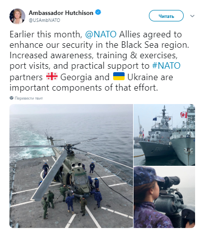 "В начале этого месяца союзники НАТО согласились на усиление мер безопасности в Черноморском регионе. Повышение осведомленности, учения и тренировки, визиты в порты и практическая поддержка партнеров НАТО Грузии и Украины является важной составляющей этих усилий", - написала Хатчисон в своем микроблоге в Twitter.