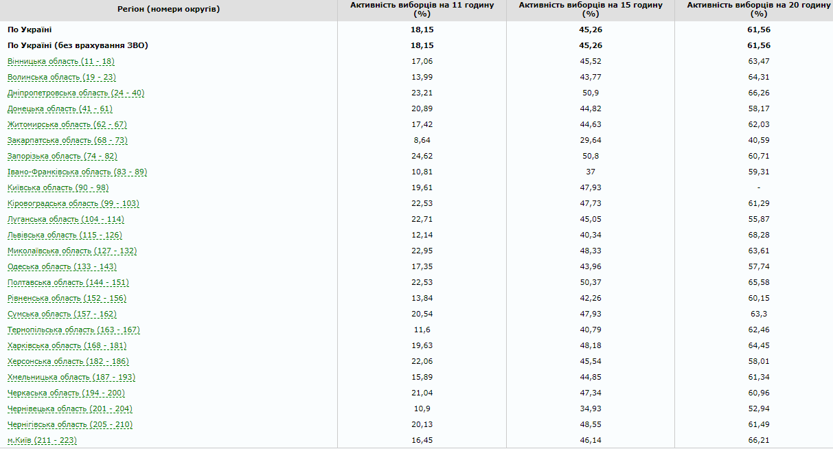 Так, по предварительным данным, в Украине проголосовало 61,56% избирателей. Самым пассивным регионом во время голосования оказалось Закарпатье: явка там составила 40,59%. Самые активные регионы: Львовская (68,28%), Днепропетровская (66,26%) области и Киев (66,21%).
