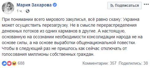 "При понимании всего мирового закулисья, всё равно скажу: Украина может осуществить перезагрузку. Не в смысле перераспределения денежных потоков из одних карманов в другие. А настоящую, основанную на осознании необходимости консолидации народа не на основе силы, а на основе выработки общенациональной повестки. Чтобы в следующий раз не пришлось как сейчас отключать от голосования миллионы собственных граждан", - отметила она.