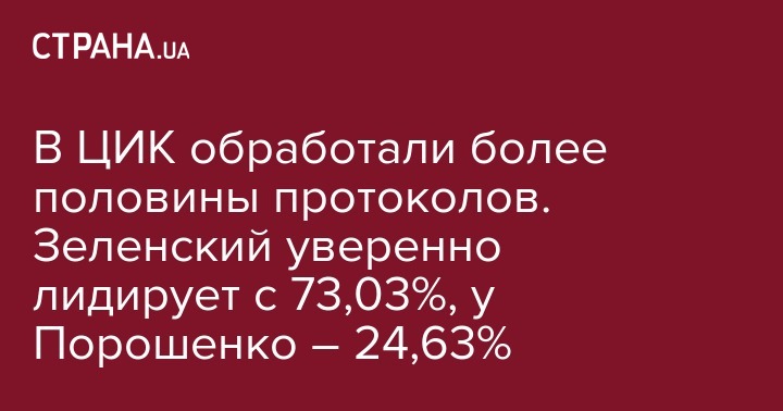 В ЦИК обработали более половины протоколов. Зеленский уверенно лидирует с 73,03%, у Порошенко – 24,63%