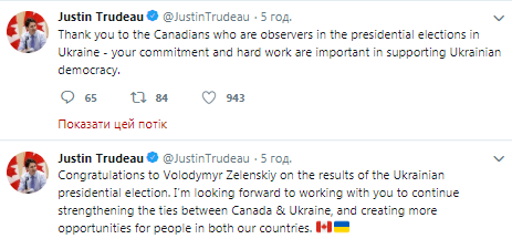 "Спасибо канадцам, которые являются наблюдателями на президентских выборах в Украине - ваша приверженность и усердная работа важны для поддержки украинской демократии", - написал премьер Канады.