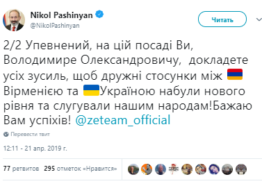 Премьер-министр Армении Никол Пашинян поздравил Владимира Зеленского с победой на выборах. Свое поздравление в Twitter армянский премьер написал на украинском языке. В нем говорится: "Искренне поздравляю Владимира Зеленского с убедительной победой на демократических выборах президента Украины! Уверен, на этой должности Вы приложите все усилия, чтобы дружеские отношения между Арменией и Украиной получили новый уровень и служили нашим народам! Желаю Вам успехов!"