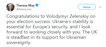 "Поздравляю Владимира Зеленского с успехом на выборах. Стабильность Украины имеет важнейшее значение для безопасности Европы, и я рассчитываю на тесное сотрудничество с вами. Великобритания твердо поддерживает суверенитет Украины", - написала Мэй.