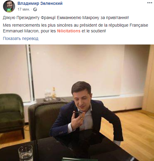 Президент Франции Эммануэль Макрон также одним из первых поздравил Зеленского по телефону. Об этом сам Зеленский написал на своей странице в Facebook. "Спасибо президенту Франции Эмманюелю Макрону за поздравления", - написал он и выложил снимок, на котором он разговаривает по телефону.