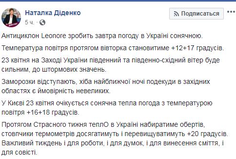 "На Страстной неделе тепло в Украине будет набирать обороты, столбики термометров будут достигать и превышать 20 градусов. Важная неделя и для работы, и для мыслей, и для вынесения мусора, и для совести", - пишет синоптик.