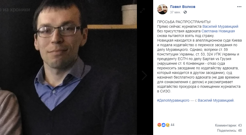 "Новицкая находится в апелляционном суде Киева и подала ходатайство о переносе заседания по делу Муравицкого. Однако, вопреки ст. 59 Конституции Украины, ст. 53, 324 УПК Украины и прецеденту ЕСПЧ по делу Бартая vs Грузия (нарушение ст. 6 Конвенции - отказ суда переносить заседание по ходатайству адвоката, который находится в другом заседании), суд назначил бесплатного адвоката (не дав времени для ознакомления с делом) и рассматривает ходатайство прокурора о помещении журналиста в СИЗО", - написал Павел Волков.