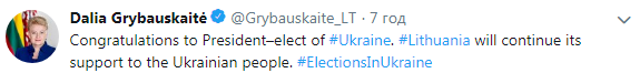 "Поздравляю избранного президента Украины. Литва продолжит свою поддержку украинского народа", - говорится в опубликованном сообщении в твиттер-микроблоге президента Литвы в понедельник, 22 апреля.