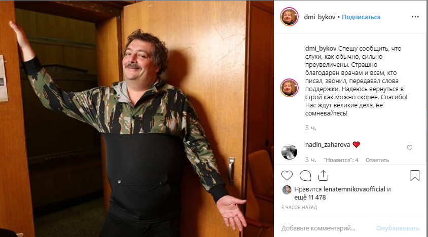 Быков опубликовал фото, на котором он широко улыбается. Он отметил, что слухи о его плохом самочувствии сильно преувеличены.