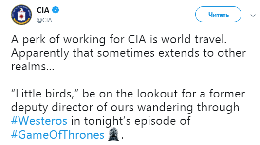 "Ищите нашего бывшего заместителя директора, который бродит по Вестеросу, в сегодняшнем эпизоде "Игры престолов", - говорилось в сообщении.