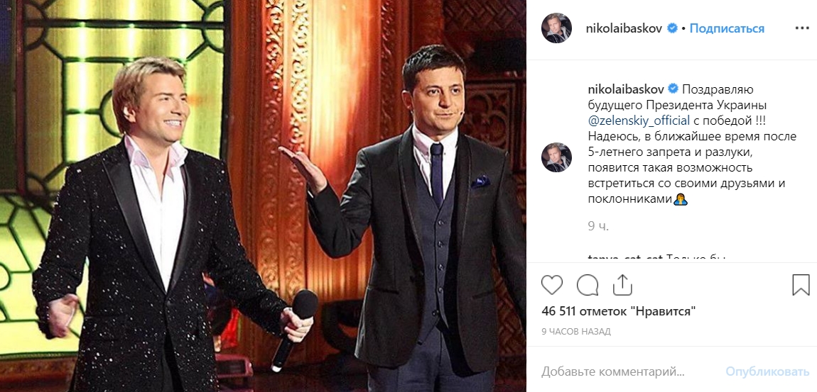— Поздравляю будущего президента Украины с победой! Надеюсь, в ближайшее время после пятилетнего запрета и разлуки появится возможность встретиться со своими друзьями и поклонниками.