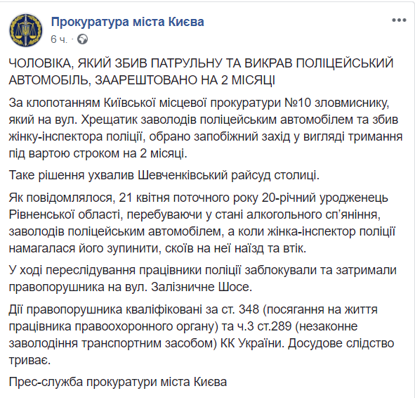Шевченковский райсуд Киева избрал меру пресечения в виде содержания под стражей сроком на 2 месяца по ходатайству Киевской местной прокуратуры №10 для злоумышленника, который на Крещатике угнал полицейскую машину и сбил патрульную. Об этом сообщает столичная прокуратура в соцсети Facebook.