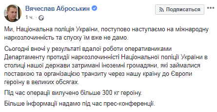 "Сегодня ночью в результате успешной работы оперативники Департамента противодействия наркопреступности Национальной полиции в столице нашего государства задержали иностранных граждан, которые занимались поставкой и организацией транзита через нашу страну в Европу героина в больших объемах", - написал он.