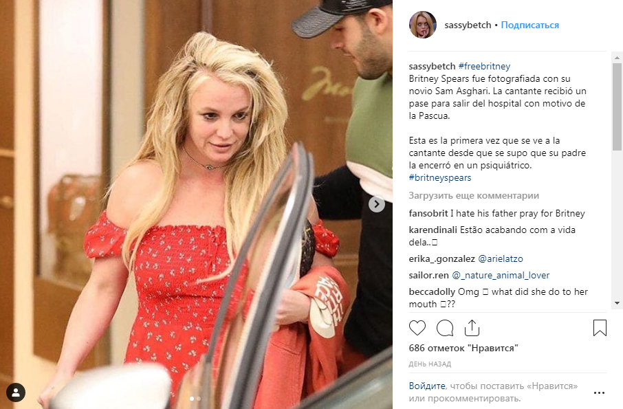 На фотографии Бритни сопровождает ее парень Сэм Асгари. Пользователи, распространяющие снимок утверждают, что певица получила пропуск на выезд из больницы по случаю Пасхи. Ранее в СМИ появлялась информация, что Спирс обратилась в клинику в связи с болезнью своего отца. Джеймс Спирс перенес две операции из-за проблем с кишечником, однако после второго хирургического вмешательства возникли осложнения.