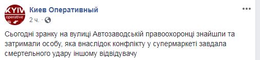 Напомним, что в "Сильпо" в очереди за пиццей произошла словесная перепалка между двумя парнями. Потом один из них резко ударил в голову второго парня. После удара парень упал без сознания, а нападающий дождался пиццы и пошел прочь. К пострадавшему поспешила одна из продавщиц, а посетители ТЦ помогли ему подняться. Друзья 33-летнего пострадавшего привезли его домой, однако позже нашли дома мертвым. Погибший оказался уроженцем Сумской области 1986 года рождения. В Киеве он проживал неподалеку от "Сильпо". Полиция начала расследование.