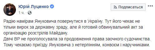 "Радуюсь намерениям Януковича вернуться в Украину. Здесь его ждет не только приговор за государственную измену, но и готовый обвинительный акт по организации расстрелов Майдана. ...Ждем приезда Януковича с нетерпением, конвоем и наручниками", - заявил Луценко.