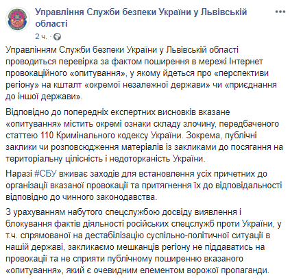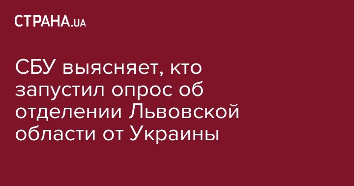 Сотрудники СБУ во Львовской области проводят проверку по факту распространения "опроса" относительно "перспектив региона", в частности предложений создания "отдельного независимого государства" или "присоединения к другому государству". Об этом сообщает пресс-служба СБУ Львовщины в Facebook.