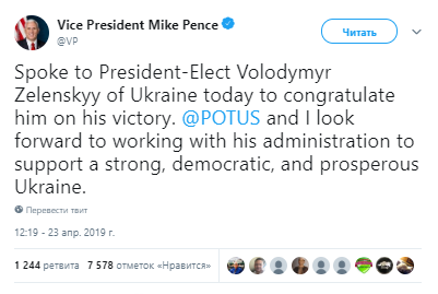 "Говорил с избранным президентом Украины Владимиром Зеленским, чтобы поздравить его с победой. Президент США и я ожидаем работы с администрацией, чтобы поддерживать сильную, демократическую и процветающую Украину", - написал Пенс.