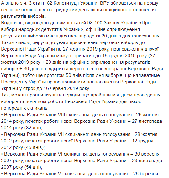 Таким образом, принимая во внимание назначение очередных выборов Верховной Рады на 27 октября 2019 года, полномочия действующей Верховной Рады Украины могут длиться и до 16 декабря 2019 года (27 октября 2019 + 20 дней на официальное обнародование результатов выборов +30 дней на открытие первой сессии новоизбранного Верховной Рады). Вовк уверен, что с теоретической и с практической точки зрения полномочия действующей Рады могут длиться до 14 декабря 2019 года, то есть еще в течение 48 дней после дня выборов, что предоставляет президенту право прекратить полномочия парламента в срок до 14 июня.