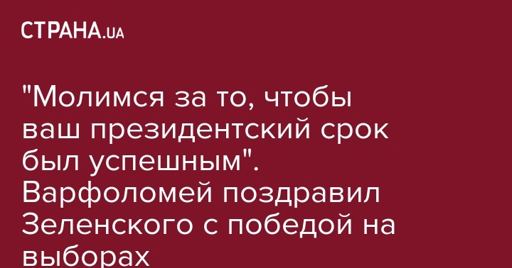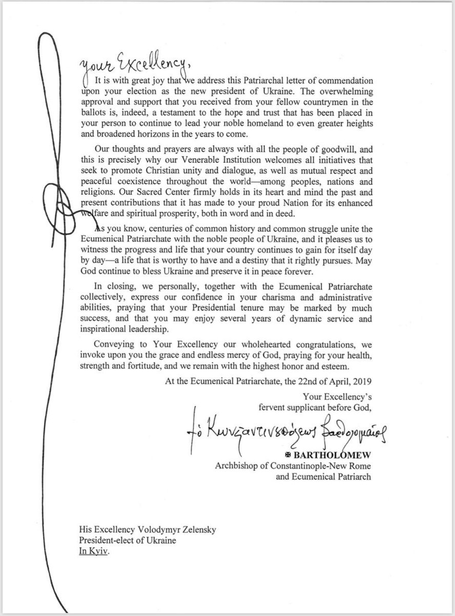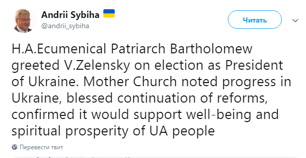 "Вселенский Патриарх Варфоломей поздравил Зеленского на выборах президента Украины. Матерь-Церковь отметила прогресс в Украине, благословила продолжение реформ, подтвердила, что будет поддерживать благополучие и духовное процветание народа Украины", - написал он.