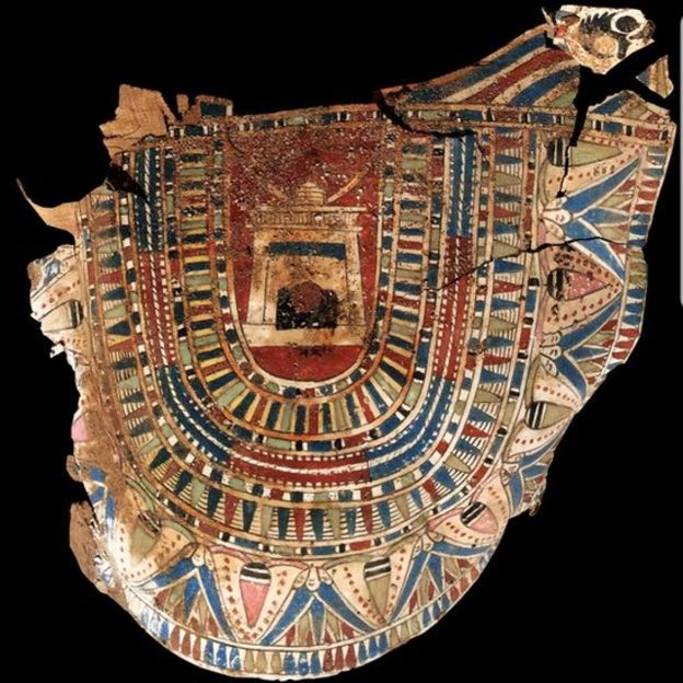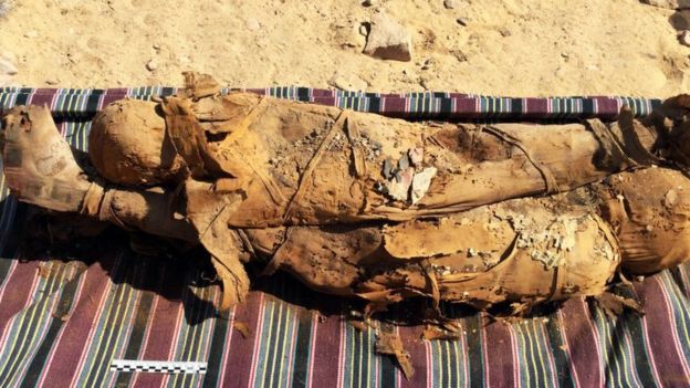 Два мумифицированных тела (по всей видимости, мать и ее ребенок) были уложены друг на друга и укрыты расписным картонажем - многослойным папирусом, который традиционно использовался в Древнем Египте для создания посмертных масок и саркофагов, повторяющих контуры тела. Еще несколько детей были захоронены отдельно, в прилегающей боковой галерее.