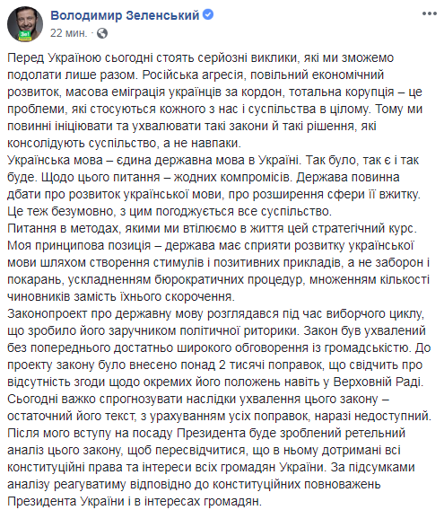 Новоизбранный президент Украины Владимир Зеленский пообещал после вступления в должность провести анализ принятого сегодня "закона о тотальной украинизации" на предмет соответствия Конституции Украины. Об этом говорится на его фб-странице.