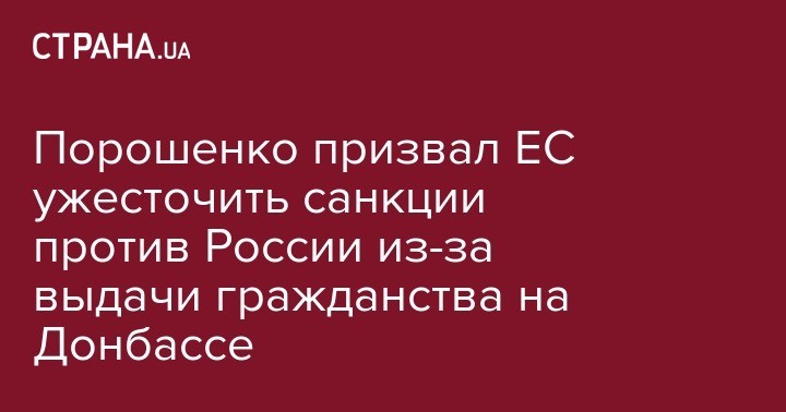 Глава Украины Петр Порошенко во время встречи с министром иностранных дел Литвы Линасом Линкявичусом заявил, что решение властей РФ об упрощении правил выдачи российских паспортов жителям оккупированного Донбасса должно вызвать жесткую реакцию со стороны международного сообщества, а ЕС должен усилить санкции против Москвы в июне. Об этом говорится в сообщении на сайте главы государства.