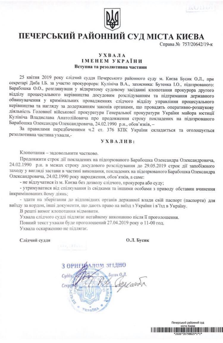 Согласно документу, суд лишь частично удовлетворил ходатайство прокурора Владислава Кулинича о продлении меры пресечения для подозреваемого Барабошко. Так, ему все еще запрещено покидать Киев без разрешения следователя, прокурора или суда и общаться со свидетелями по его делу. Кроме того, он должен сдать соответствующим властям свой загранпаспорт. Решение вступает в силу с момента оглашения и обжалованию не подлежит.