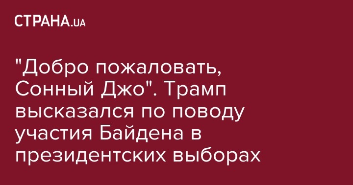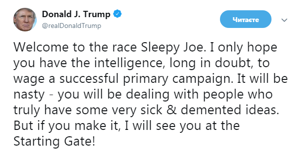 "Добро пожаловать в президентскую гонку Сонный Джо (Sleepy Joe - Прим.Ред.). Это будет неприятно - вы будете иметь дело с людьми, у которых действительно есть очень больные и безумные идеи. Но если вы сделаете это (сумеете выиграть первое голосование между членами Демпартии, праймериз - Прим.Ред.), я увижу вас на старте", - написал Трамп.