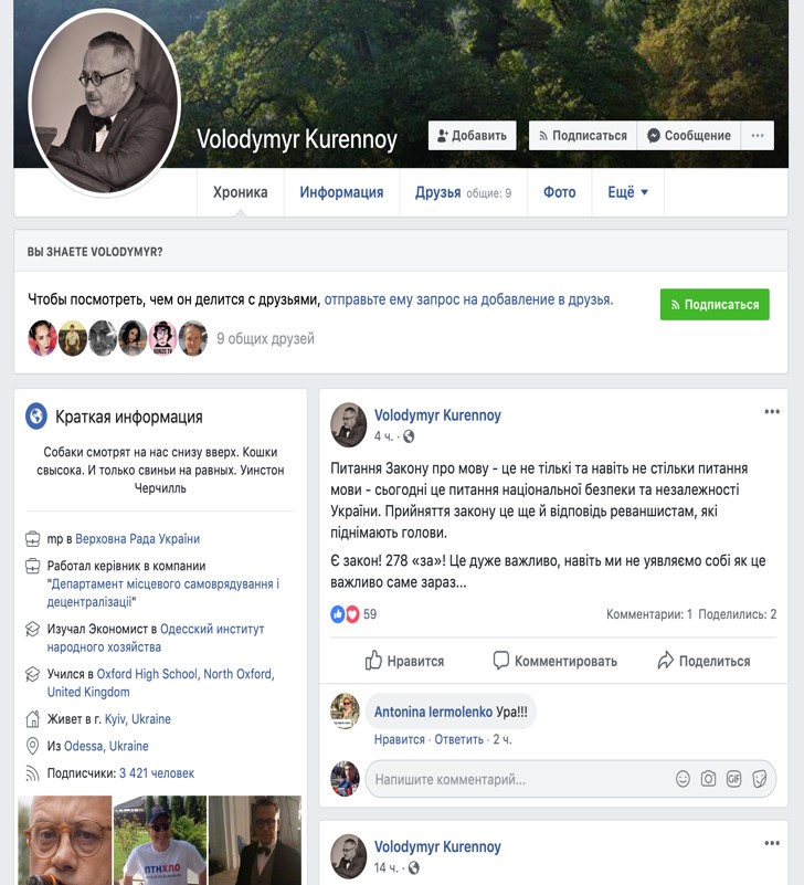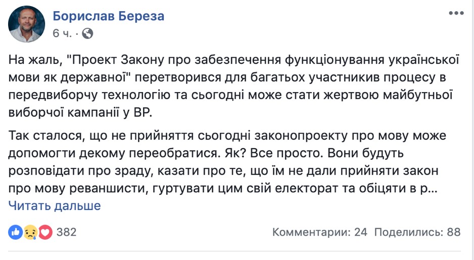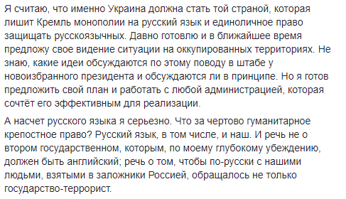 Накануне голосования он написал пост о том, что нужно оспорить право России на русский язык и чтобы с населением Донбасса говорила на русским языке не только Москва. Однако после этого проголосовал за закон об украинизации.