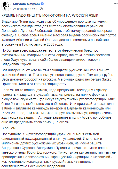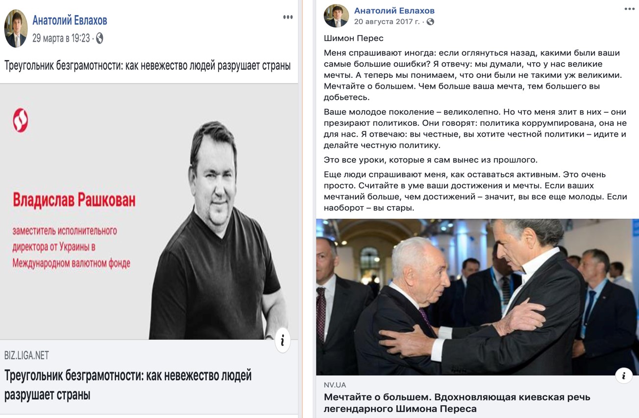 Но сам Анатолий Сергеевич в той же соцсети Facebook излагает свои мысли на русском. Приведём в пример несколько недавних публикаций Анатолия Евлахова.