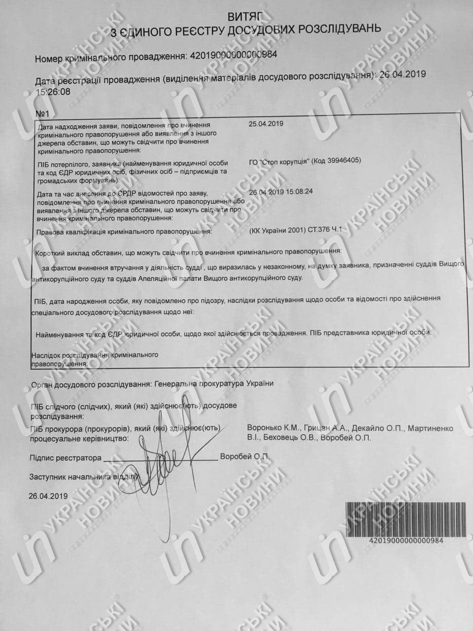 Отмечается, что дело открыто по обращению общественной организации "Стоп коррупции". Уголовное производство было начато по части 1 статьи 376  (вмешательство в деятельность судебного органа) Уголовного кодекса.