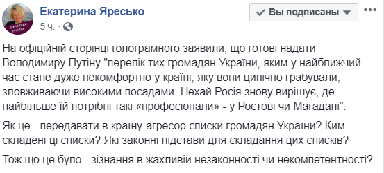 "На официальной странице голограммного заявили, что готовы предоставить Владимиру Путину "перечень граждан Украины, которым в ближайшее время станет очень некомфортно в стране, которую они цинично грабили, злоупотребляя высокими должностями. Пусть Россия снова решает, где больше всего ей нужны такие "профессионалы" - в Ростове или Магадане".