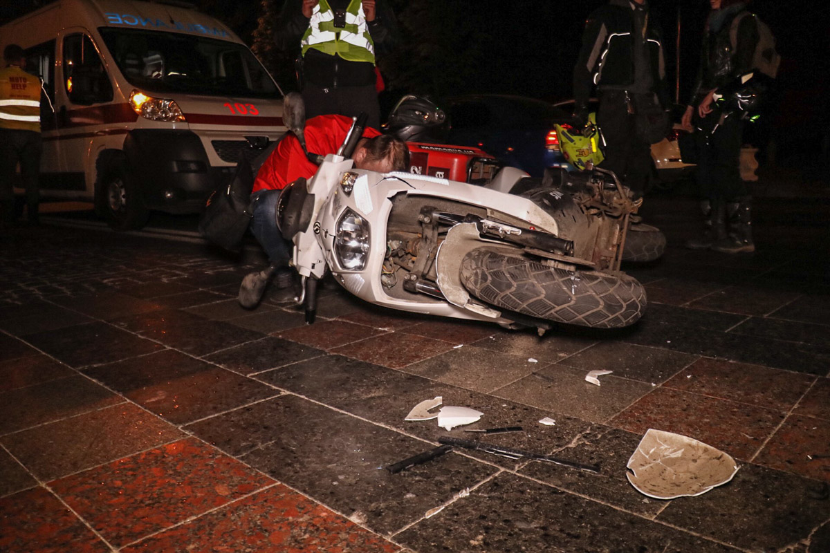 В Киеве доставщик пиццы на скутере влетел в Mercedes напротив университета Шевченко. Видео
