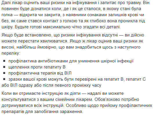 "Далее врач оценит ваши риски инфицирования и спросит о травме. Он должен будет узнать когда, где и как это произошло, в каком состоянии была игла - открытая или закрытая, с имеющимися признаками остатков крови или без, как именно произошел контакт с иглой и как глубоко она проникла под кожу. Будьте готовы максимально четко вспомнить все детали", - подчеркнула и.о. главы Минздрава.