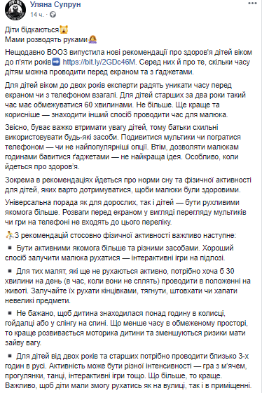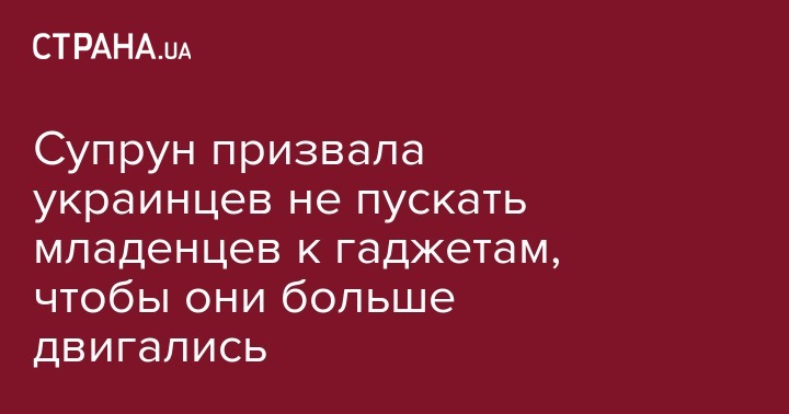 И.о. министра здравоохранения Украины Ульяна Супрун считает, что детям до двух лет лучше не проводить время перед экраном или с телефоном в руках. Для детей старше двух лет такое время должно ограничиваться 60 минутами. Еще лучше и полезнее - находить другой способ занять малыша. Об этом главный медик Украины написала на своей странице в соцсети Facebook.
